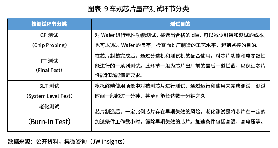 与消费级和工业级芯片应用相比,车规级芯片应用对环境要求、抗振动冲击、可靠性、一致性、寿命等方面的要求更为严苛,因此车规测试项目复杂度更高、测试条件更严苛、测试时间更长。具体体现在:在成品测试阶段,与非车规芯片成品测试流程相比,车规级芯片成品测试需要经过严格的三温测试(RT FT,CT FT,HT FT)、老化测试(Burn in)、SLT测试等环节,而非车规芯片仅需要常温测试,无需高低温测试。因此车规级芯片测试的测试时长和成本也均相应增加。