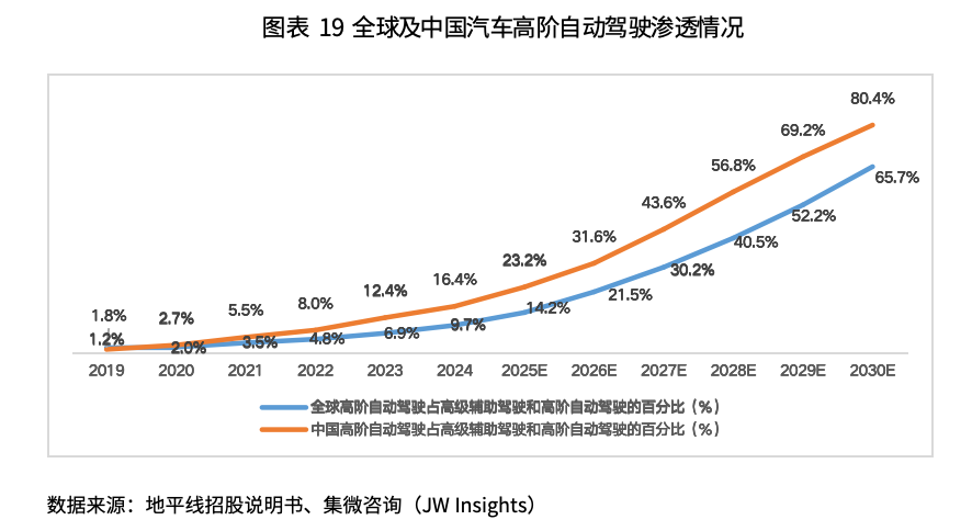 智能化方面,全球汽车产业正从以高级辅助驾驶(ADAS)为主向更高阶的自动驾驶与智能座舱深度融合阶段演进。目前,L2/L2+ 级辅助驾驶已成为全球主流新车的重要配置,高算力芯片、感知融合与软件定义汽车(SDV)正在推动汽车智能化加速渗透。预计到 2030 年,全球范围内具备高阶自动驾驶能力的车型渗透率将显著提升,但整体推进节奏仍受法规、安全责任认定及区域技术成熟度差异影响。中国汽车智能化进程加速,2025年高阶自动驾驶在高级辅助驾驶和高阶自动驾驶中的占比为23.2%,预计2030年将上升至80.4%,显著高于全球平均水平。