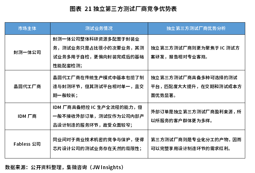 独立第三方测试服务厂商在技术专业性和效率上的优势更明显,同时出具的报告结果中立且客观。相比之下,封测一体厂商的核心业务是封装,配套进行芯片测试,业务占比较小,如2024年日月光测试服务业务占比9%,安靠测试服务业务占比约15%。而第三方测试厂商专注于晶圆测试及芯片成品测试环节,台湾京元电子测试业务占比超80%,大陆第三方测试企业测试业务占比超90%,在专业性、灵活性以及独立性方面竞争优势更为突出。