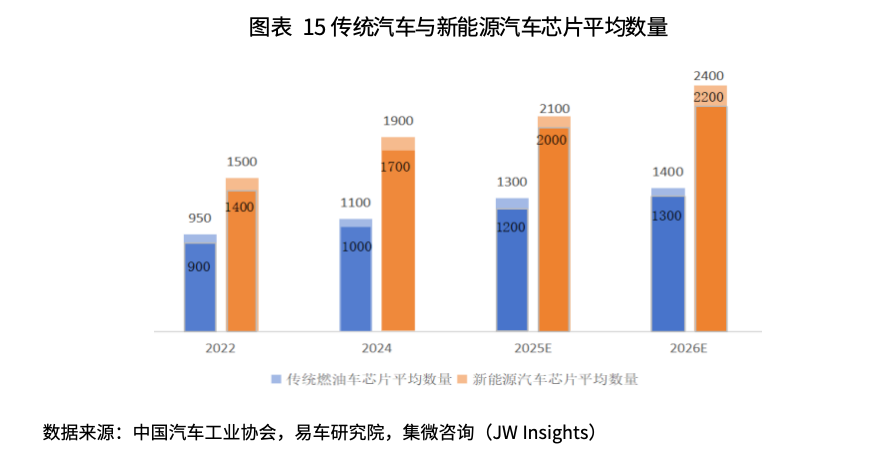 目前,汽车芯片的需求量正在急剧上升,近五年期间整车芯片数量呈现翻倍式增长。随着汽车智能化和网联化的发展,计算芯片、安全芯片、无线通信芯片、存储芯片、传感器数量在持续增加。据中汽协以及易车研究院统计,2022年中国传统燃油车单车芯片数量为900-950颗,新能源汽车单车芯片数量为1400到1500颗,2024年传统燃油车单车芯片数量来到1000-1100颗,新能源单车芯片平均数量来到1700-1900颗。根据集微咨询测算,2025至2026年,传统燃油车单车芯片数量达到1200-1400颗,新能源汽车单车芯片数量达到2000-2400颗。