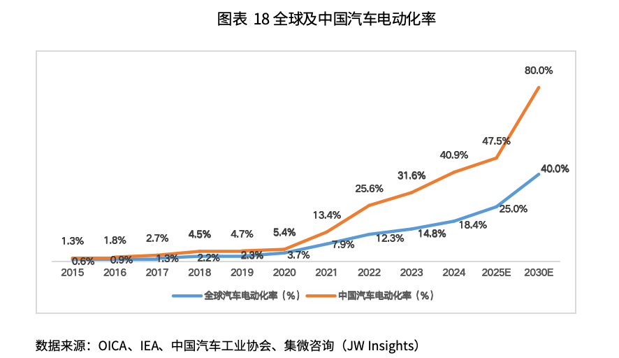 从全球范围看,汽车电动化已进入加速普及阶段。根据国际能源署(IEA)数据,2025 年全球新能源汽车(含纯电和插混)新车销量占比已提升至约 25%,预计到 2030 年全球电动车销售占比近 40%。中国是全球汽车电动化进程中最领先、最具影响力的市场,2025 年中国新能源汽车销量占新车市场比重已接近50%,显著高于全球平均水平。在政策持续支持、产业链成熟、成本下降及充换电基础设施完善的共同推动下,中国汽车市场电动化率仍将进一步提升,预计 2030年电动化率有望达到80%。