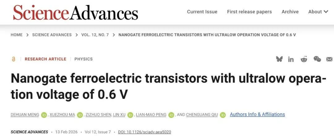 北京大学在非易失性存储器领域取得突破性进展。电子学院邱晨光-彭练矛团队首次提出“纳米栅超低功耗铁电晶体管”。团队通过优化铁电晶体管器件结构,引入纳米栅极电场汇聚增强效应,研制出可在0.6V超低电压下工作的铁电晶体管,能耗降低至0.45 fJ/μm,并且将物理栅长缩减到1纳米极限,为国际上迄今尺寸最小、功耗最低的铁电晶体管,为构建高性能亚1纳米节点芯片和高算力AI芯片架构提供了更具潜力的新物理机制存储器件。该突破性成果以“Nanogate ferroelectric transistors with ultralow operation voltage of 0.6 V”为题,在线发表于Science子刊《科学·进展》(Science Advances)。