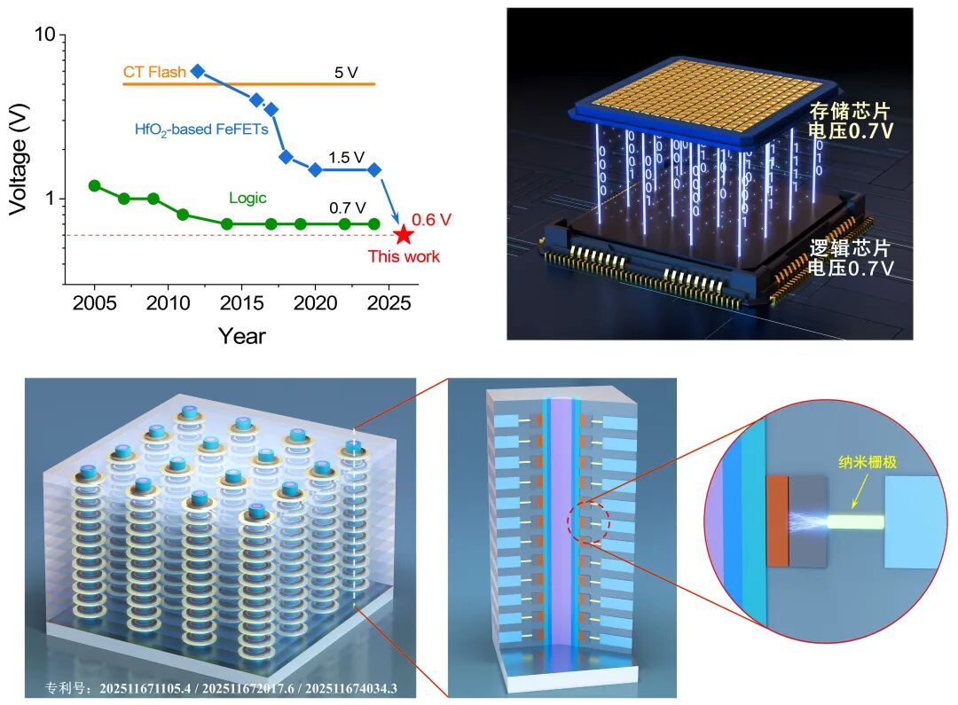 逻辑器件和存储器件是构建集成电路的两大底层元器件。逻辑单元构成芯片的“运算与控制中枢”,存储单元构成芯片的“数据仓库”,两者占集成电路市场规模的70%以上。在摩尔定律的驱动下,逻辑晶体管通过制程微缩和架构迭代,性能不断提升,当前业界已实现2纳米节点逻辑芯片量产,并且CMOS晶体管在0.7V的低电压下工作。然而相比之下,非易失性存储器几十年来性能发展相对滞后,主流的非易失性Flash存储技术难以微缩到先进节点;最为关键的是,Flash存储需要在5V以上高电压下完成数据擦写。因此,现有芯片必须在逻辑单元和非易失存储之间集成升降压电路以完成工作电压转换,这带来了额外面积开销、能耗增加等一系列问题。更为重要的是,现代AI芯片架构的核心在于数据流优化,逻辑和存储之间的电压不匹配直接导致数据交互不畅通,严重拖累了AI芯片算力,并大幅增加了能耗。