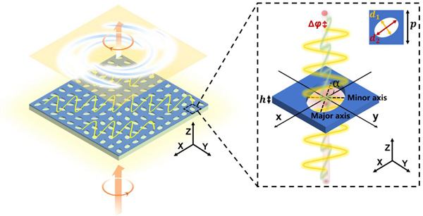 图2. 基于双折射导模谐振相位梯度超表面的波前调控示意图