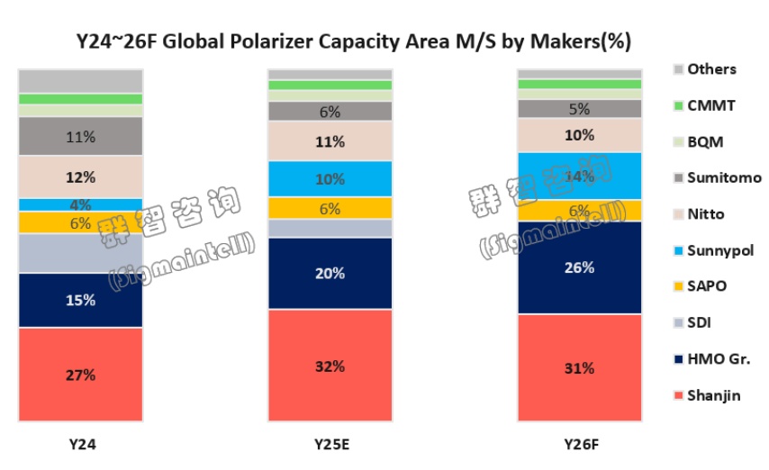 群智咨询数据显示,2025 年全球偏光片市场已形成清晰的竞争梯队:杉金光电以超30%的产能占比稳居全球第一,恒美集团通过收购原SDI产线实现跨越式增长,产能市占率突破 20%并预计2026年升至26%,双巨头格局初步确立;三利谱并购住友部分产线后,市场份额从不足5%跃升至全球第三,形成 “两超一强” 的竞争格局。