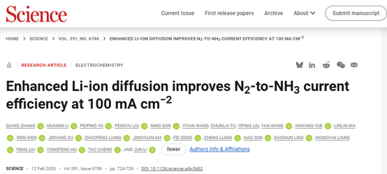 北京时间2026年2月13日,上海交通大学变革性分子前沿科学中心李俊团队在 《科学》(Science) 上在线发表了题为“Enhanced Li-ion diffusion improves N2-to-NH3 current efficiency at 100 mA cm-2” 的研究论文。研究团队首次报道了在常温常压连续流条件下100 mA cm-2高电流密度和21%高能效的稳定电合成氨新体系,为绿氨规模化生产提供了颠覆性技术路径。