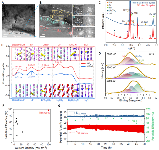 结构深度分析发现,DDLA中LiF表层通过低结合能特性加速锂离子去溶剂化,而Li2CO3中间层则形成三维离子渗透网络。同步辐射X射线光谱证实(图2C-D),这种层次化结构在10-20纳米尺度上建立了连续的离子传输梯度。特别值得注意的是,DDLA内部发现的对称分布的Li3N晶畴与电解液界面形成分子级接触,为氮气还原提供了特异性活性位点。该结构特征解释了DDLA电极在高电流密度下实现高效锂介导氮还原合成氨的原理——Li2CO3通道将锂离子通量提升至常规均质SEI体系的100倍,同时LiF/Li3N异质界面显著抑制了析氢副反应。这些发现不仅揭示了电极-电解质界面离子传输的级联调控机制,其分级离子传输机制也为设计下一代高效合成氨电极提供了明确的界面工程原则。