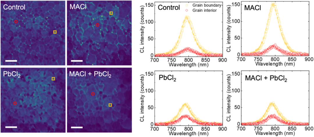 提高钙钛矿薄膜的体相质量对于实现更高性能的光伏器件至关重要。含氯添加剂:包括氯化铅(PbCl2)和甲基氯化铵(MACl)—这些钙钛矿光伏领域广泛采用的标准添加剂,能有效控制结晶动力学和晶粒形貌。然而,不同形式的氯化物添加剂对纳米尺度相均匀性和发光均匀性的具体影响仍未得到充分探究。