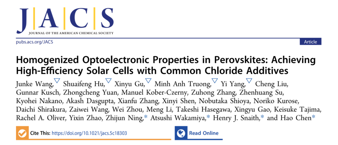 近日,上海交通大学溥渊未来技术学院未来光伏研究中心陈昊副教授团队联合牛津大学、日本京都大学和上海科技大学于国际顶尖化学领域期刊《美国化学会志》(Journal of the American Chemical Society,JACS)上发表最新文章“Homogenized Optoelectronic Properties in Perovskites: Achieving High-Efficiency Solar Cells with Common Chloride Additives”。上海交通大学溥渊未来技术学院陈昊副教授、牛津大学Henry J Snaith教授、京都大学Atsushi Wakamiya教授、上海科技大学宁志军教授为论文的共同通讯作者,上海交通大学溥渊未来技术学院陈昊团队2025级博士生顾欣宇为论文的共同第一作者。