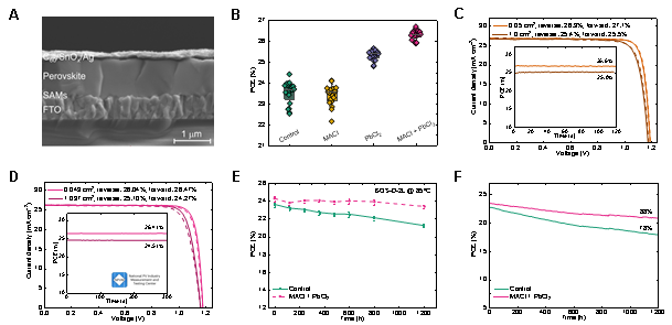 基于这些发现,研究团队制备了反式结构钙钛矿太阳能电池,在0.05 cm²和1 cm²的器件面积上分别实现了认证准稳态效率26.4%和24.5%。此外,这些器件表现出优异的运行稳定性,在模拟AM1.5G光照和高温(65℃)条件下连续进行1200小时的最大功率点追踪后,仍能保持初始性能的88%。这项研究结果阐明了不同形式氯化物添加剂在作用机制上的差异,为推进大面积、高效率且热稳定的钙钛矿光伏技术提供了可行的策略。