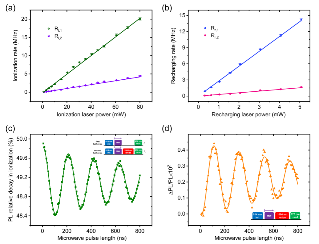 实验结果图。a)光电离速率随1064 nm光功率变化的实验曲线;b)光充电速率随914 nm光功率变化的实验曲线;c)改性双空位PL6色心在电离过程中的荧光强度相对衰减随微波脉冲长度变化的曲线;d)改性双空位PL6色心在电离后的荧光强度随微波脉冲长度变化的曲线。