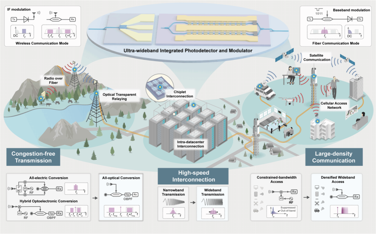 近年来,随着AI技术的快速发展,更高密度、更高性能算力成为未来人工智能领域竞争中的关键一环。如何实现算力芯片间及大规模数据中心内更高速的互联成为制约算力资源发展的关键瓶颈。与此同时,星地通讯、智能网联汽车等日益增长的泛在接入需求对以太赫兹(THz)通信为代表的下一代移动通信技术提出了更高容量和更低时延的挑战。此外,面向未来“万物互联”时代,一个电信通讯网络中的长期痛点也愈发突出:光纤通信与无线通信在信号架构与硬件约束上存在带宽鸿沟,阻碍了统一的系统设计,导致两者难以在同一套基础设施上实现高速且兼容的端到端传输。