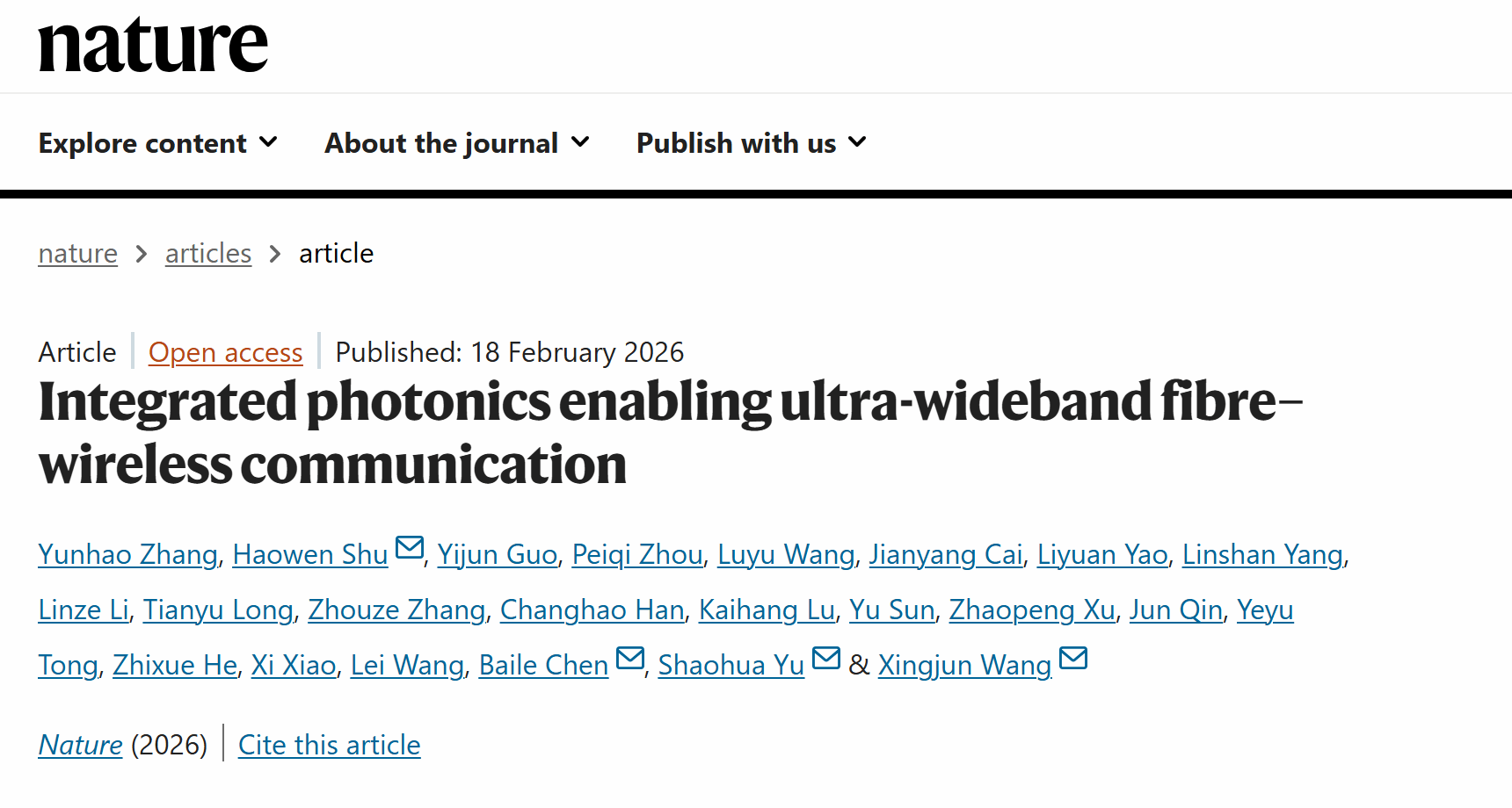 2026年2月18日,研究论文《集成光子学赋能超宽带光纤-无线通信》(“Integrated photonics enabling ultra-wideband fibre–wireless communication”)在线发表于国际顶尖学术期刊《自然》(Nature)。北京大学电子学院王兴军教授-舒浩文研究员团队与鹏城实验室余少华院士团队、上海科技大学陈佰乐副教授团队、国家信息光电子创新中心肖希总经理团队等合作,在下一代无线通信(6G)及光通信领域取得突破性进展,在国际上首次提出了集成“光纤-无线融合通信”概念,率先实现了光纤和无线通信系统间的跨网络无缝融合。通过自研的超宽带光电融合集成芯片和AI赋能的先进均衡算法,该项研究所研发的系统在电信通讯的所有主要场景中(包括光纤、无线及其混合链路)均能支持创世界纪录的数据传输速率,实现“一套系统、跨场景复用”。