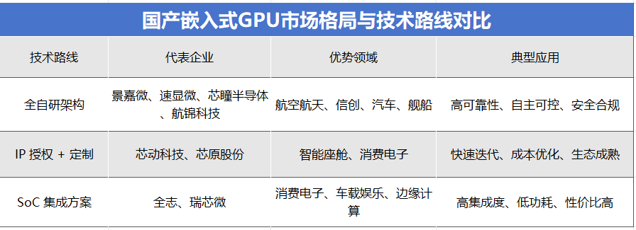 伴随端侧AI机遇的持续释放,国内已涌现出一批具备竞争力的嵌入式GPU企业,并形成“全自研架构、IP授权+定制、SoC集成”三大技术路线的产业格局。