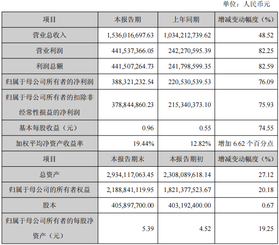 2月26日,浙江蓝特光学股份有限公司(证券代码:688127,以下简称“蓝特光学”)发布2025年度业绩快报公告。公告显示,2025年公司实现营业总收入1,536,016,697.63元,同比增长48.52%;实现归属于母公司所有者的净利润388,321,232.54元,同比增长76.09%;归属于母公司所有者的扣除非经常性损益的净利润:378,844,860.23元,同比增长75.93%;基本每股收益:0.96元,同比增长74.55%。