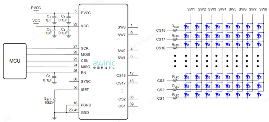 • 144路(8 x 18)矩阵LED驱动