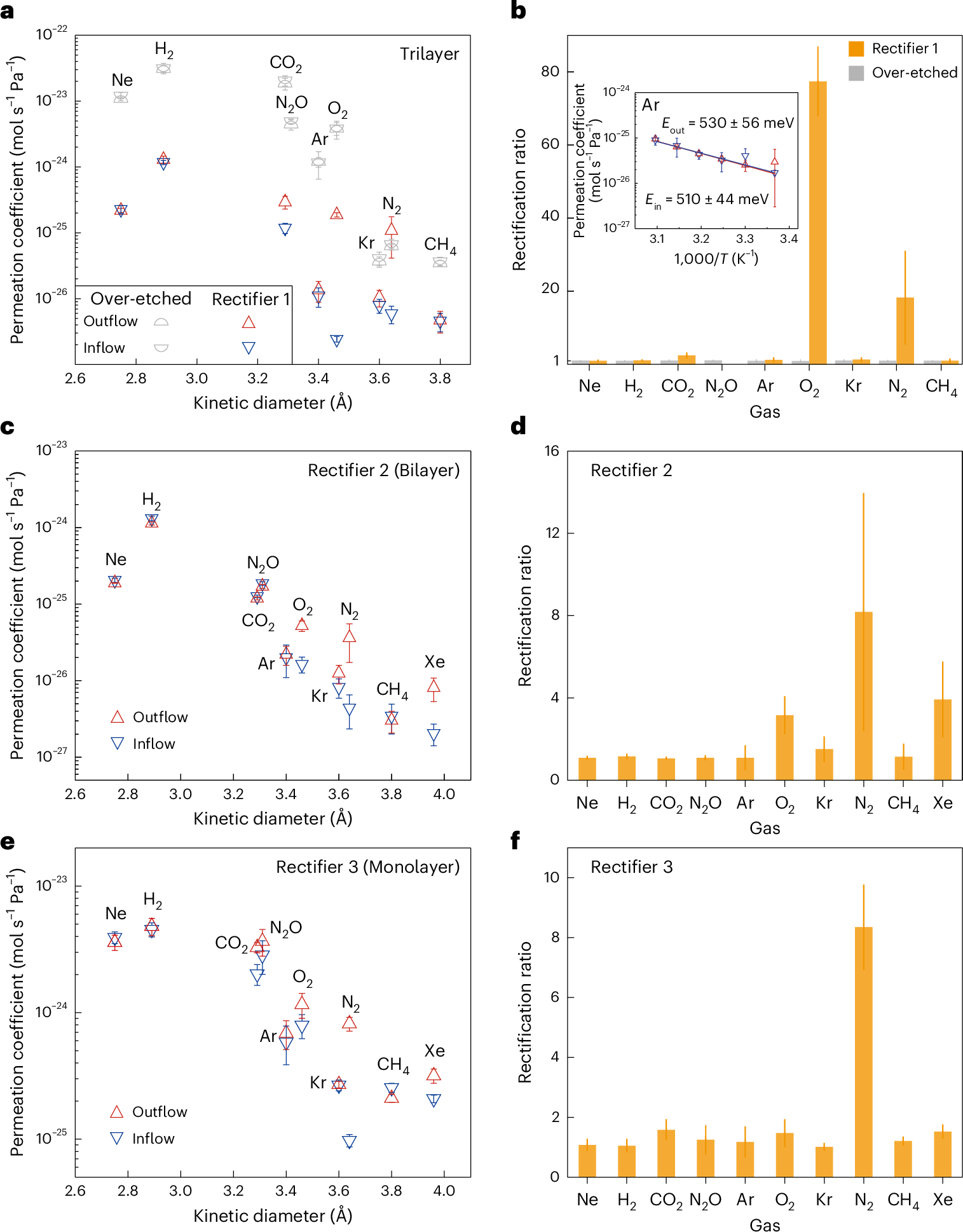 为系统探究范德华力对气体分子整流的调控机制,团队进一步针对10种组分、形状和尺寸各异的典型气体开展了高精度整流性能测试(图4),其中7种气体存在整流效应。由于气体输运对孔的原子结构高度敏感,实验结果呈现出难以避免的随机性。通过大量器件的多次实验,团队最终归纳出了清晰的规律:氧气与氮气的整流比总体最高,可达两个数量级;惰性气体的整流比随动力学直径由氖气、氩气至氪气、氙气逐步增大而显著提高。此外,作为对照,团队通过延长刻蚀时间增大孔径,发现对过刻孔,小分子气体的输运速率提升几个数量级,但整流效应随之消失。
