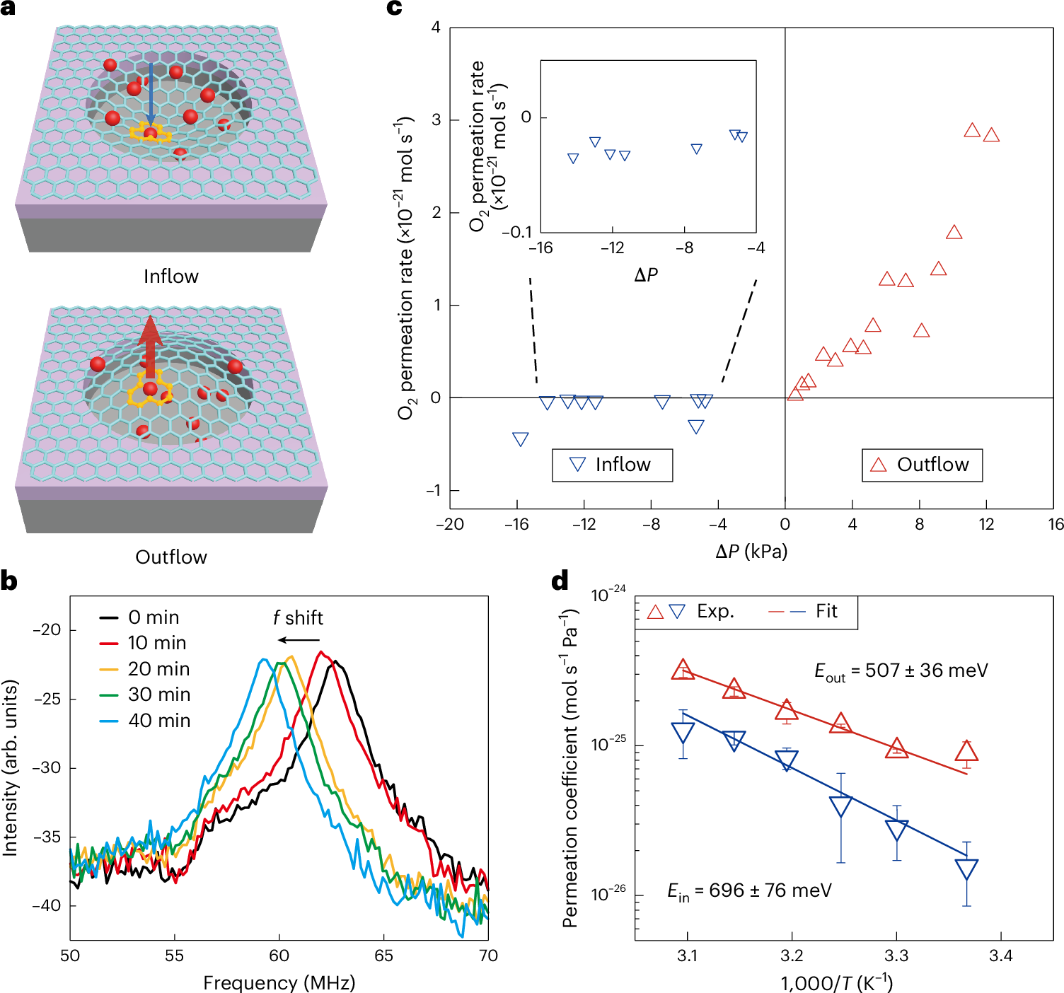 研究团队进而设计搭建了原子级负反馈控制的臭氧刻蚀系统(图2),不仅能在石墨烯上精准刻蚀埃米孔,还能同时在孔边缘形成跨平面不对称分布的含氧官能团,从而构建出Janus结构。为了验证这种埃米孔能否实现气体整流输运,团队制备了10个整流器件(石墨烯层数从单层到三层),并分别测试了典型气体正反两个方向的输运行为(分辨率高达每秒钟几个气体分子),其中氧气(图3)和氮气呈现出显著的整流现象。