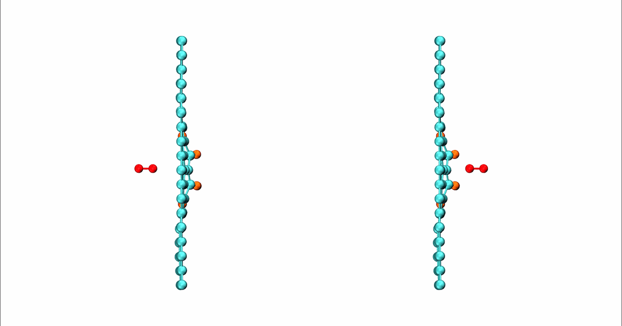 最后,研究团队利用高通量密度泛函理论(DFT)计算,系统探究了气体整流的物理机制(图5),发现较小的孔径(一般小于3.50Å)以及孔周边存在高密度含氧官能团是实现Janus不对称结构的关键。在此基础上,分别采用柔性与刚性模型,验证了不对称结构可诱导产生不对称能垒,并证实了非局域范德华相互作用对能垒差异起决定性作用。基于刚性模型实现了67种埃米孔构型、10种气体的高通量计算,理论能垒差与实验整流比呈现出良好的统计一致性。分析表明,气体分子的极化率对实现整流输运尤其重要;对比极化率相近的气体,进一步发现四极矩乃至更高阶矩也很关键,相关物理机制仍有待深入探索。此外,团队开展了从头算分子动力学(AIMD)模拟(图6),观测到与DFT计算结果一致的整流现象。