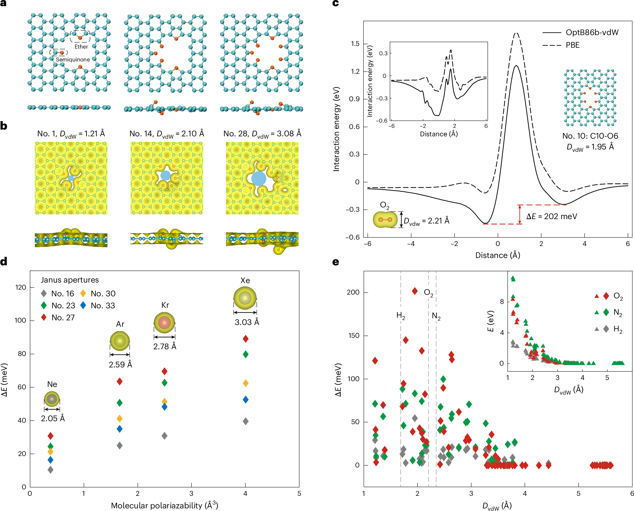 研究团队首先提出了利用不对称(Janus)埃米孔实现气体分子整流的全新设计理念(图1)。相比传统通道,该体系将通道长度缩短至单原子层,而孔径则与气体分子的等效直径相当,从而使气体输运过程受到跨孔能垒的主导。在此基础上,通过构筑沿输运方向不对称的Janus结构,使气体分子从正反两个方向过孔时面临显著不同的能垒。根据Arrhenius定律,输运速率随能垒高度呈指数变化。理论上,室温下0.1eV的能垒差就可以带来约50倍的整流效应。这一设计理念为实现限域空间的高效气体整流提供了基本的理论图像。