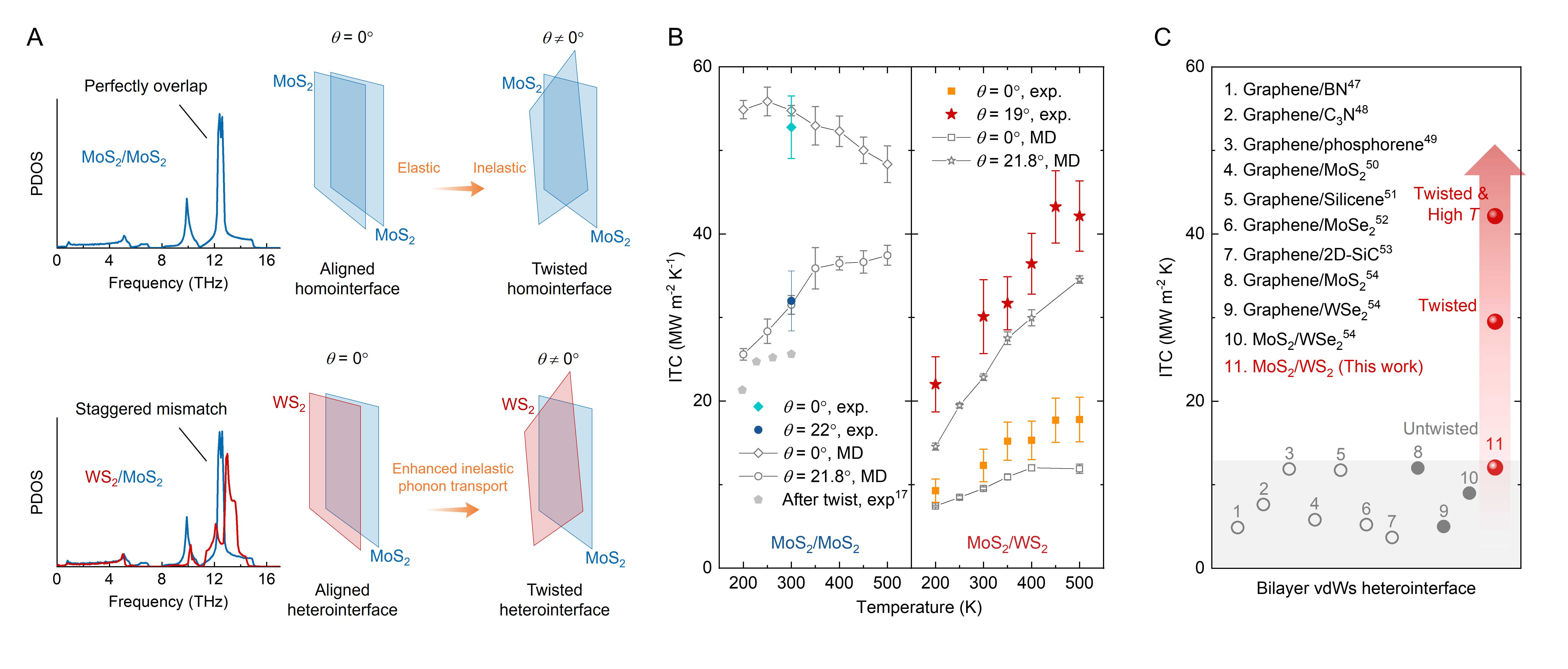 近日,清华大学航天航空学院张兴教授、马维刚教授团队在二维范德华异质结界面热输运研究领域取得重要突破。在后摩尔时代的电子器件中,范德华异质结因其可设计的能带结构和优异电学特性而成为新型集成电路的重要候选。然而,不同材料之间的声子失配导致界面热导普遍较低(通常约10MW m-2K-1量级),严重制约器件的散热性能和可靠性。长期以来,国内外研究人员普遍认为,在同质结构中引入层间转角会破坏晶格的对称性,增强无序散射,从而降低界面热导。基于这一共识,“扭转”通常被视为抑制热输运的因素。