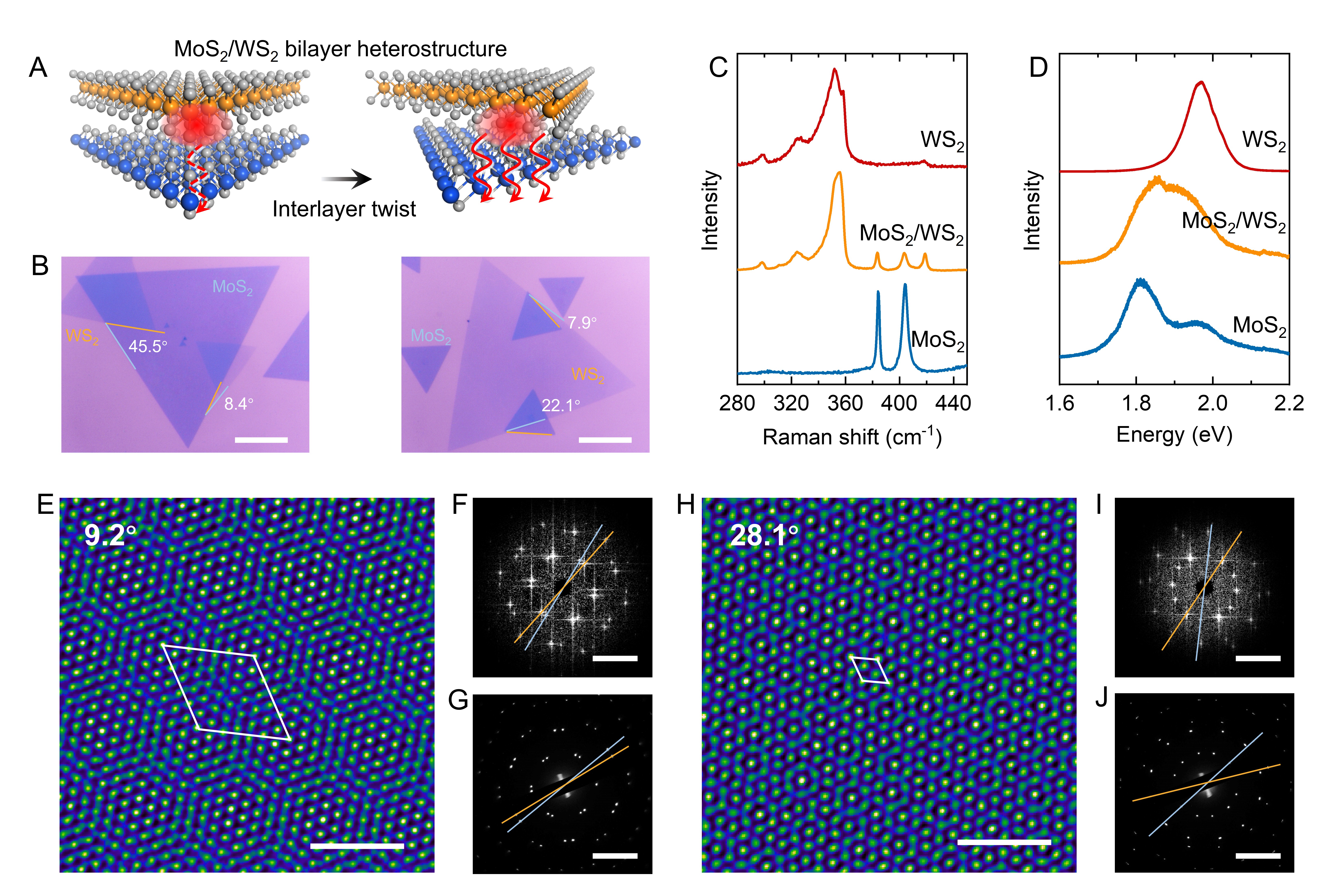 图1.不同转角异质双层MoS2/WS2结构的制备与表征