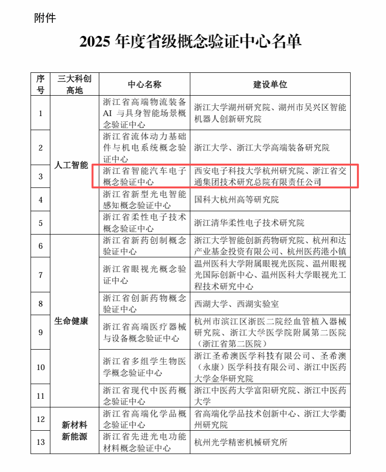 西安电子科技大学智能汽车电子概念验证中心入选浙江省首批省级概念验证中心认定名单