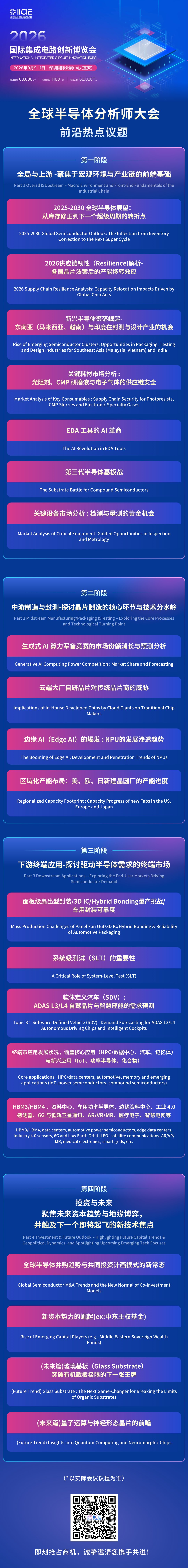 在“投资与未来发展”主题板块,全球顶尖投资领域分析师将联动头部创投机构,深度挖掘2026-2030年半导体产业的结构性投资机遇,重点解读算力芯片、HBM、化合物半导体等热门赛道的投资逻辑与商业模式创新方向。同时,针对后摩尔时代的技术演进,分析师们将探讨3.5D异质整合、混合键合、玻璃基板等核心技术的发展瓶颈与突破路径,预判未来核心技术与应用创新趋势,为企业技术研发与布局提供专业参考。