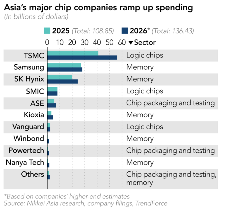 据机构对主要芯片供应商计划的分析以及市场研究公司TrendForce的估计,来自韩国、中国台湾、日本和中国大陆的领先芯片制造商和芯片封装及测试服务提供商承诺在2026年总共投入超过1360亿美元,比一年前增长超过25%。