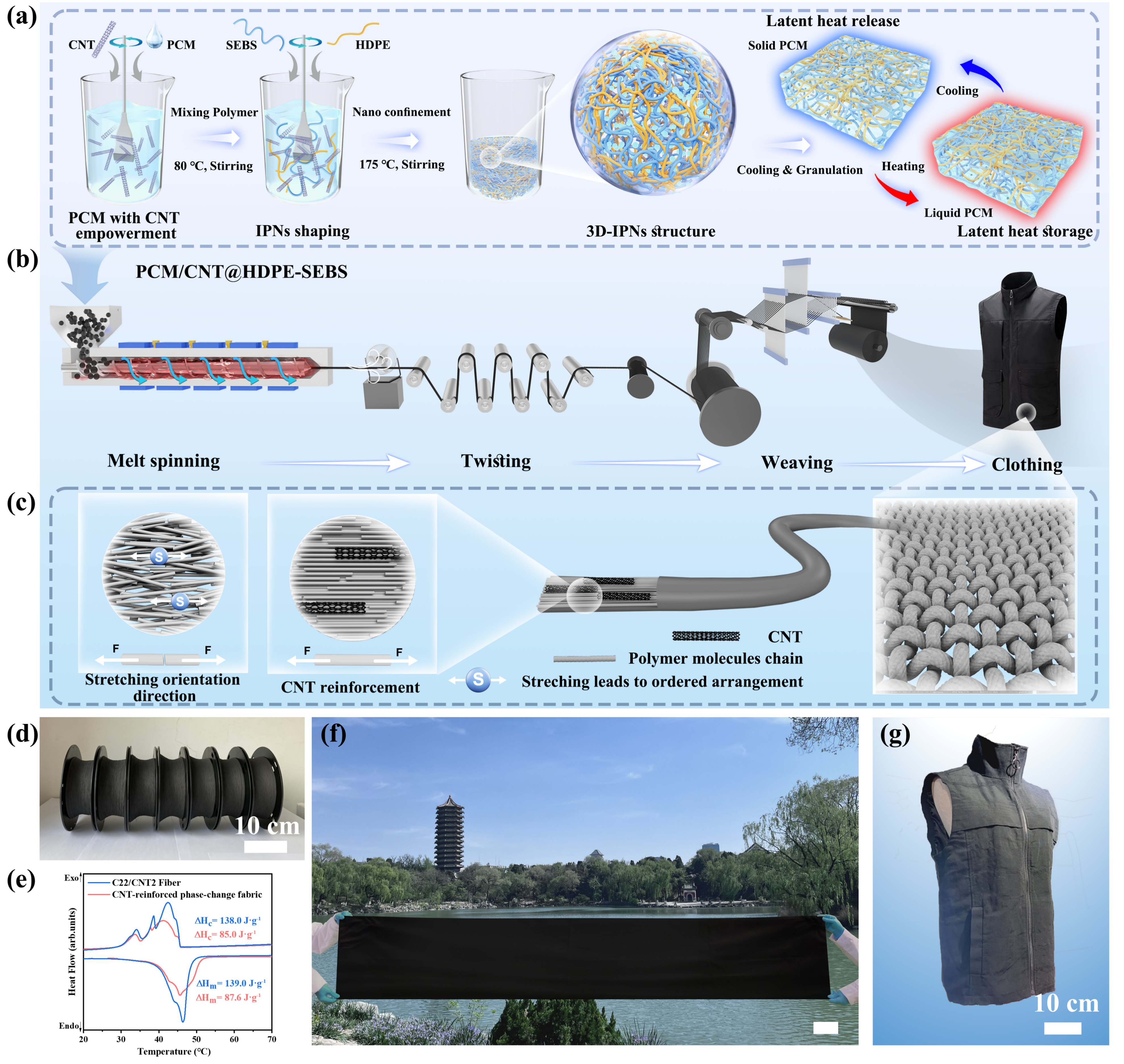 C22/CNT@HDPE-SEBS、C22/CNT纤维和PCM基织物的制造过程示意图:(a)C22/CNT@HDPE-SEBS复合材料的制备流程图(b)通过双组分熔融纺丝制备的相变织物和C22/CNT纤维服装(c)CNT对相变纤维取向的影响(d)连续生产的C22/CNT纤维的照片(e)C22/CNT2纤维冷却和加热过程曲线的结晶焓值和熔融焓值。同样,CNT增强相变织物的冷却和加热过程曲线的结晶焓值和熔融焓值(f)比例尺为20cm的CNT增强相变纤维织物的照片(g)热调节相变服装的照片