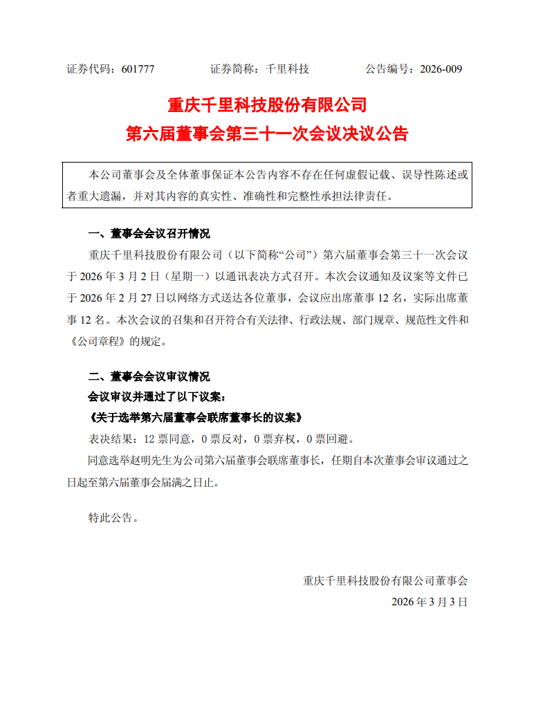 3月4日,千里科技发布公告,称召开第六届董事会第三十一次会议。在此次会议上,同意选举荣耀前CEO赵明为公司第六届董事会联席董事长,任期自本次董事会审议通过之日起至第六届董事会届满之日止。