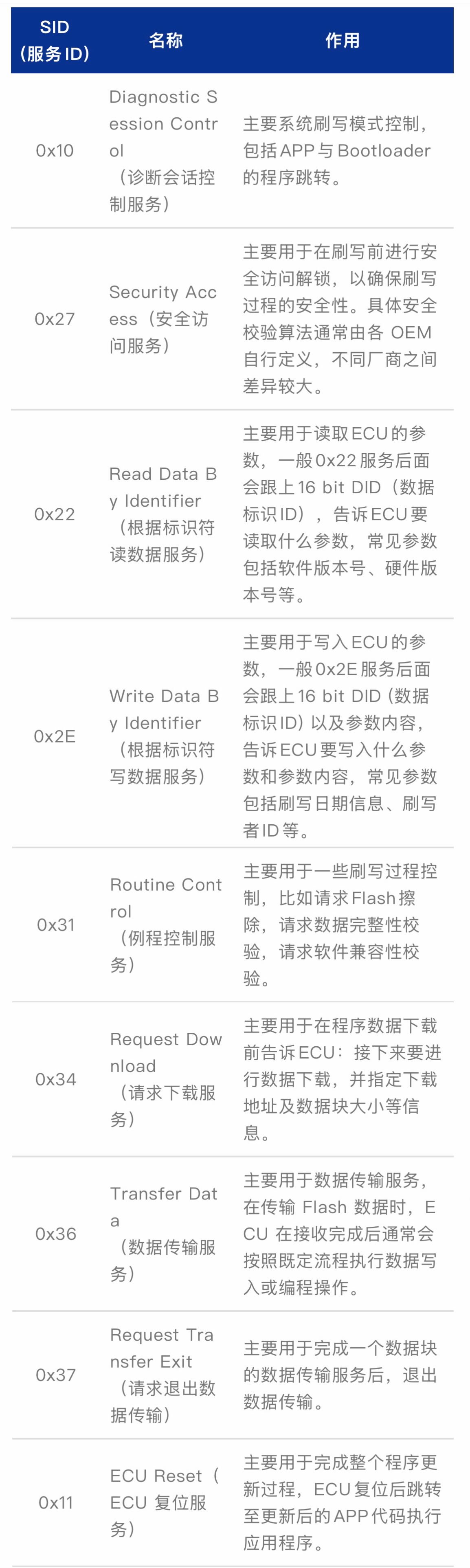 • 安全访问服务(UDS SID 0x27):在执行升级操作前,设备通常会通过 UDS 的安全访问服务进行权限验证。服务器需要提供相应的安全凭证(如密钥或挑战响应数据),验证通过后系统才会开放刷写权限,防止未授权设备强制刷写。