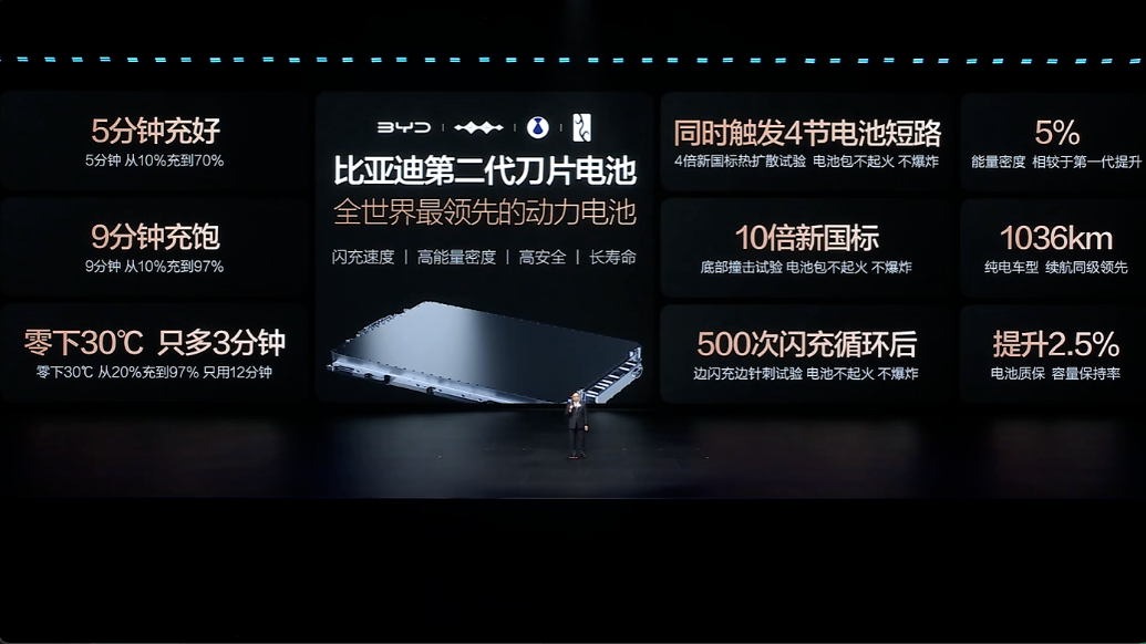 3月5日,比亚迪正式发布第二代刀片电池,公布了其在充电速率、极寒环境表现及安全测试等维度的核心数据。根据官方披露的信息,新一代电池的闪充技术可实现电量从10%充至70%仅需5分钟,从10%充至97%耗时9分钟。