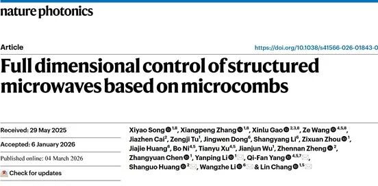 2026年3月4日,北京大学电子学院常林团队与合作者在顶级学术期刊《自然·光子学》(Nature Photonics)在线发表了题为“Full dimensional control of structured microwaves based on microcombs”的研究文章。该团队创新性的利用集成微腔光梳驱动微波光子天线阵列实现结构微波全维度协同控制,并基于此进行通感一体化应用。通过多维度协同复用将6G信道速率提升30倍,同时实现四维高效信息感知。这一成果为6G通信、高精度感知以及量子计算等领域开辟了全新的发展路径。