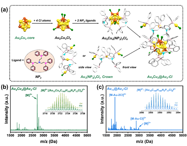 图1. (a)Au9Cu4@Au3-Cl的结构分析。Au9Cu4@Au3-Cl(b)和Au13@Au3-Cl(c)的高分辨质谱分析。