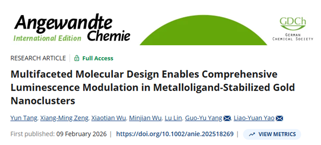 近日,北京理工大学化学与化工学院杨国昱/姚燎原教授团队在国际顶级化学期刊《Angewandte Chemie International Edition》上发表题目为“Multifaceted Molecular Design Enables Comprehensive Luminescence Modulation in Metalloligand-Stabilized Gold Nanoclusters”的研究论文。北京理工大学为唯一通讯单位,杨国昱教授和姚燎原教授为论文通讯作者,化学与化工学院博士研究生唐云为论文第一作者。此项研究得到了北京市自然科学基金、国家自然科学基金、中央高校基础研究业务经费等资助以及上海同步辐射国家蛋白质科学研究设施和北京理工大学分析测试中心、化学化工实验中心的支持。