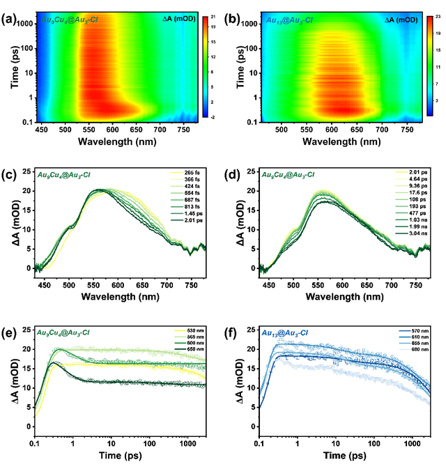 图4. Au9Cu4@Au3-Cl(a)和Au13@Au3-Cl(b)的3D飞秒瞬态吸收谱图。(c)、(d) Au9Cu4@Au3-Cl在不同时间范围内的瞬态吸收曲线。Au9Cu4@Au3-Cl(e)和Au13@Au3-Cl(f)在选定波长下的动力学拟合曲线。
