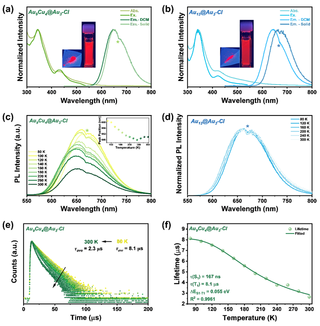 图3. Au9Cu4@Au3-Cl(a)和Au13@Au3-Cl(b)的常温发射和激发谱图。Au9Cu4@Au3-Cl(c)和Au13@Au3-Cl(d)从80 K至300 K发射谱图。(e)Au9Cu4@Au3-Cl升温过程中的寿命衰减曲线。(f)Au9Cu4@Au3-Cl的平均寿命与温度的拟合曲线。