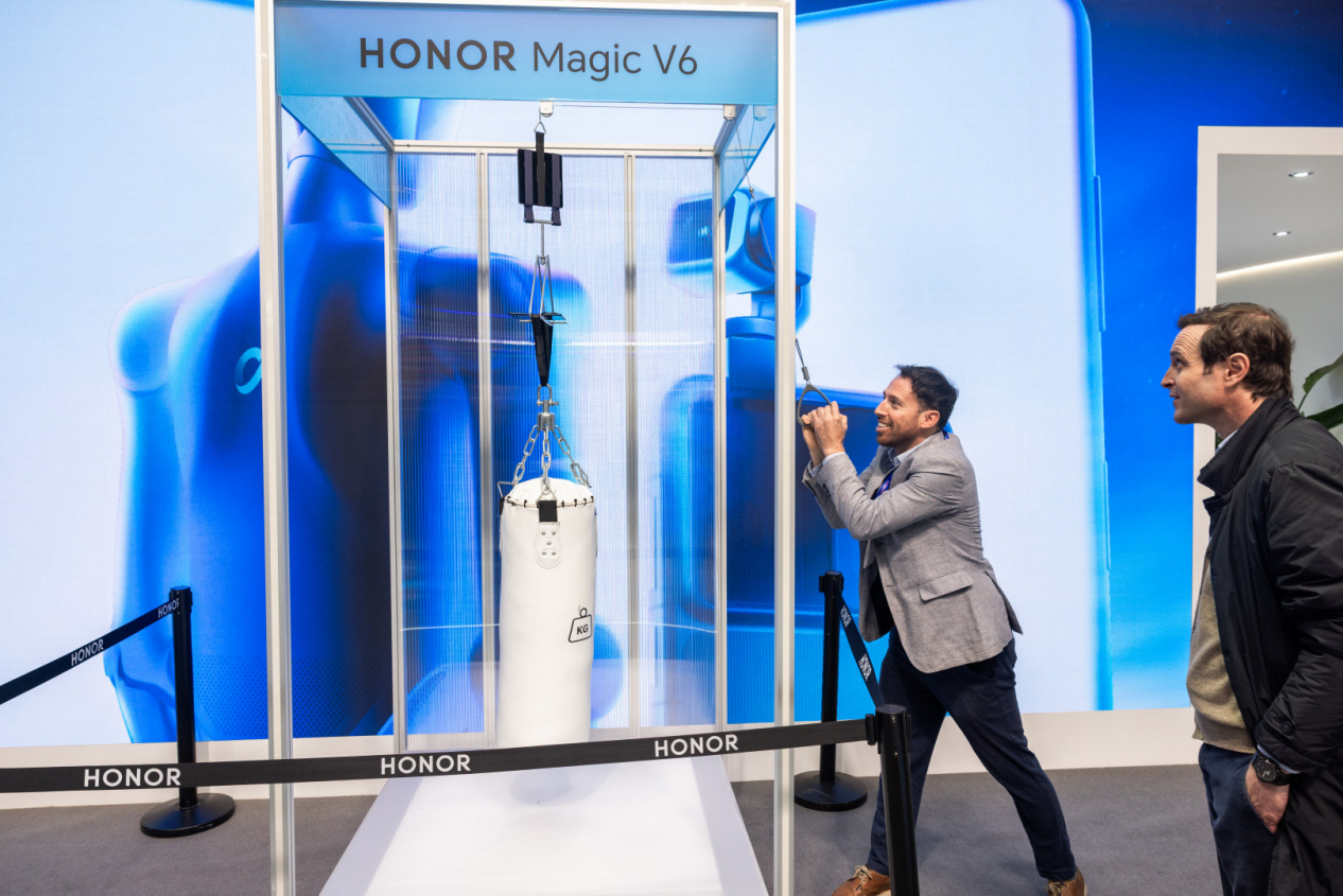 在MWC的展台,荣耀Magic V6同机器人手机Robot Phone、机器人产品一样,吸引着众多目光。荣耀以一种极为接地气的方式,将Magic V6的铰链、防水、电池等核心技术能力直观地展示出来。