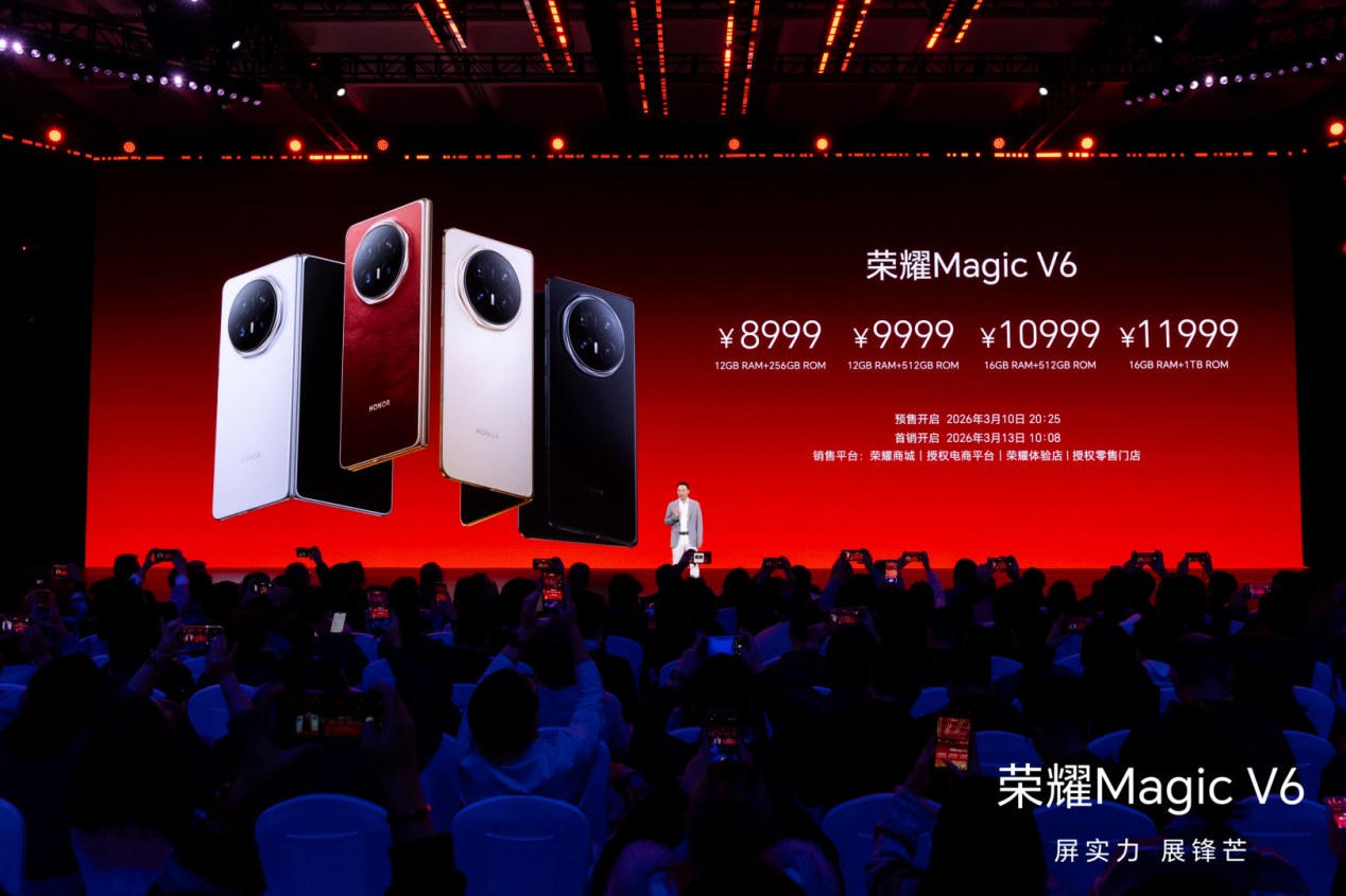 3月10日,荣耀新一代折叠屏旗舰荣耀Magic V6在深圳重磅发布,其全新配色赤兔红开售仅 20 分钟,全版本便在电商全平台迅速售罄,人气火爆。这是继一周前的MWC之后,荣耀再次吸引全球科技的目光。