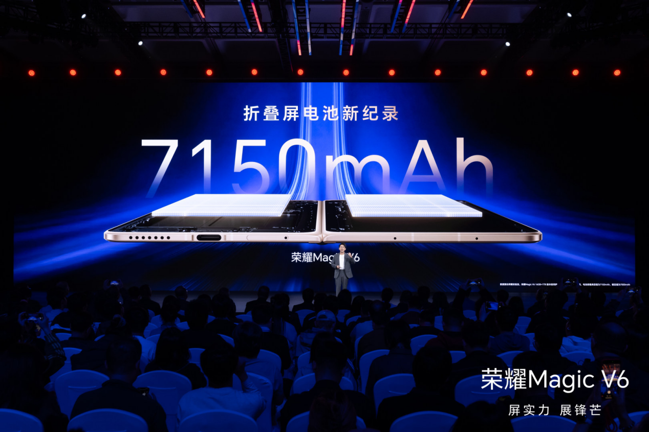 在续航方面,荣耀Magic V6采用最新一代青海湖刀片电池,首次将折叠屏电量提升至7000mAh以上(7150mAh),同时实现了32%的硅含量、0.15mm最薄叠层厚度和985Wh/L的最高能量密度,一举打破四项行业纪录。