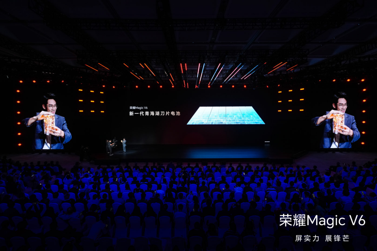 负重演示中,荣耀Magic V6化身承重件,支撑起数十公斤的重量,体现出优秀的抗压承重能力。防水演示中,体验者戴上手套,在水箱中完成触屏、拨打电话等操作。刀片电池飞牌挑战中,0.15毫米的电池极片厚度让人印象深刻。