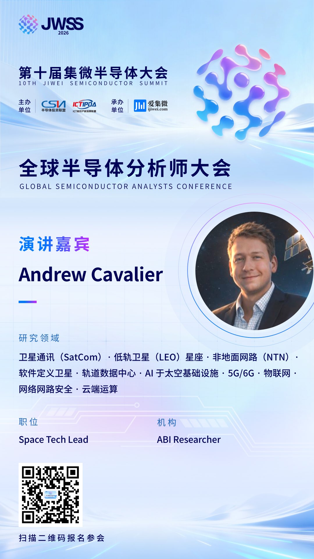 我们非常荣幸地邀请到ABI Research 太空技术首席分析师(Space Tech Lead)Andrew Cavalier重磅出席本次大会,他将为大会注入太空技术与半导体融合的前沿视角,带来卫星通信、太空基础设施领域的深度解析。