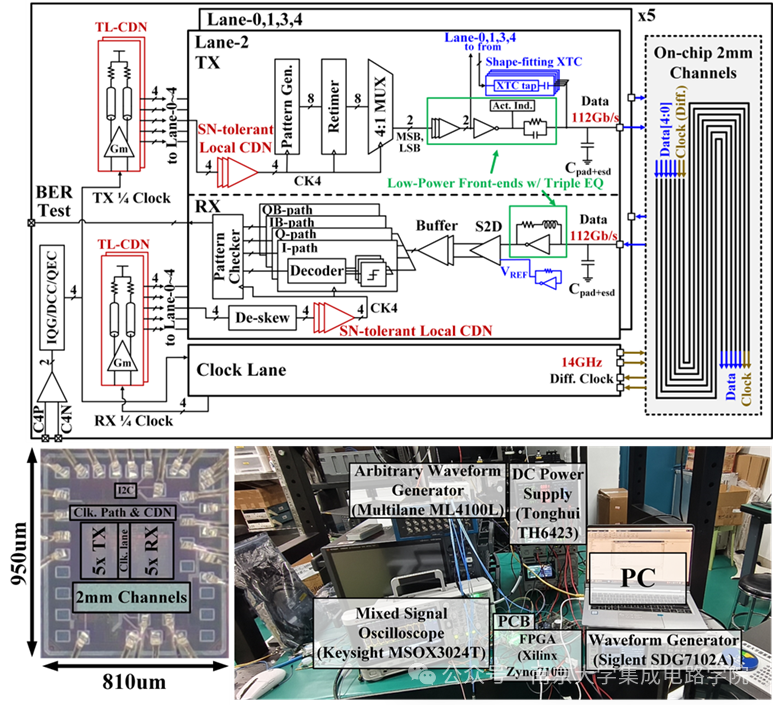 面对行业痛点,南京大学杜力、杜源团队联合平头哥(上海)半导体有限公司研究团队,在28nm CMOS工艺下,设计出一款集成4源串扰抵消与电源噪声抑制技术的5路单端112Gb/s/pin PAM4收发机,攻克了高密度短距离存储接口的信号完整性难题。该成果已应用于平头哥AI智算芯粒接口研发,相关产品亮相央视《新闻联播》。该芯片的核心创新与贡献主要体现在三大方面: