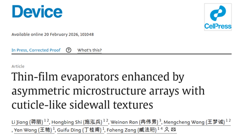 近日,上海交通大学集成电路学院(信息与电子工程学院)臧法珩副教授团队在仿生非对称微结构阵列增强薄膜蒸发领域取得新进展。通过三维微纳加工技术将微纹理毛细结构与非对称设计结合,为热管理与相变传热器件的高效稳定运行提供了新的结构设计路径。相关成果以“Thin-film evaporators enhanced by asymmetric microstructure arrays with cuticle-like sidewall textures”为题发表于《Cell Press》旗下期刊《Device》。