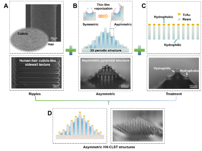 研究团队通过三维微纳加工技术,在微柱侧壁构建了侧壁纹理结构(HHCLST)。该微纹理一方面能增强界面钉扎效应,另一方面为液体提供了更可控的向上输运路径,从而在微结构表面维持更稳定、更连续的薄膜区域,并显著抑制弯月面回缩引发的薄膜退化。在此基础上,团队进一步引入非对称微结构阵列:利用结构的不对称性实现定向液体补给,从而能够从液体供给区持续向蒸发区域输运液体,进而扩大有效薄膜蒸发面积,提升薄膜蒸发在宏观器件中的可持续贡献。