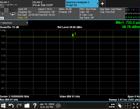 基于以上对于调制信号的分析,诺思从结构、材料、设计三方面优化,提升调制信号下的输入功率。下图为诺思微产品在WLAN调制信号2440 MHz、20 MHz BW(PAPR=10 dB,占空比50%)下的功率曲线,平均输入功率大于40 dBm,峰值功率大于50 dBm,性能稳定可靠。