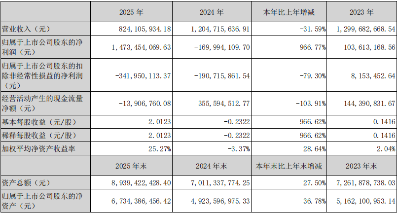 3月26日,赛微电子发布2025年年度报告。报告显示,公司全年实现营业收入8.24亿元,同比下降31.59%;归属于上市公司股东的净利润为14.73亿元,同比大幅增长966.77%;扣除非经常性损益后的净利润为-3.42亿元,同比下降79.3%。