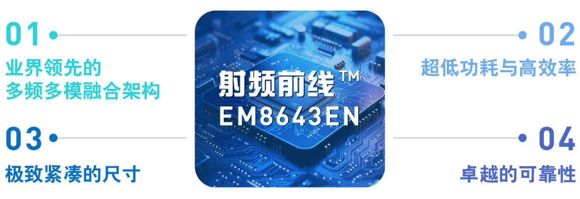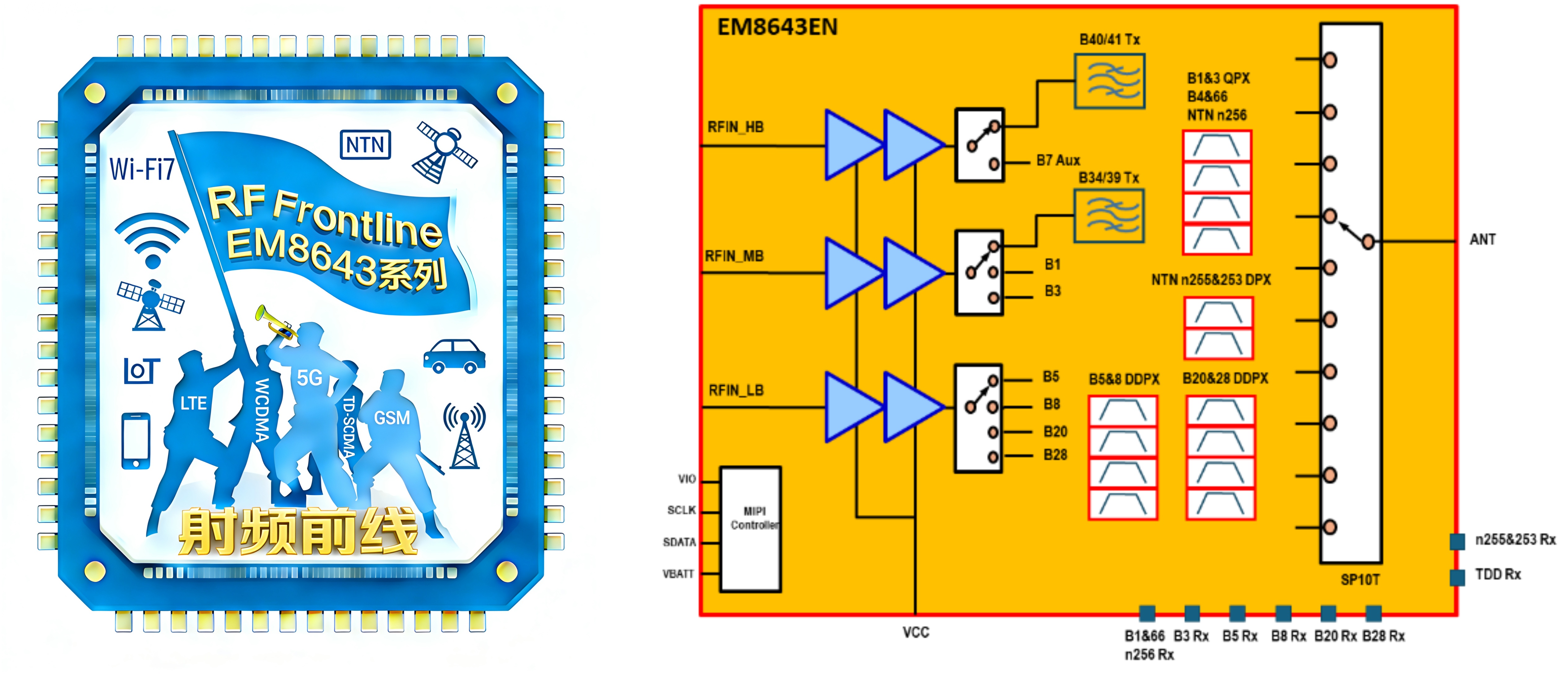 EM8643EN:4.0x6.8封装全球首款卫星/地面双模蜂窝网PAMiD(右)