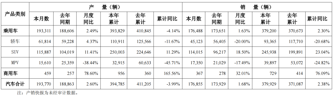 细分车型来看,乘用车3月产量193311辆、销量176488辆,同比分别增长2.49%、1.63%;其中SUV车型3月销量114015辆,同比增长18.5%,成为乘用车核心增长点,轿车、MPV车型产销则呈下滑态势。商用车板块表现亮眼,3月产量459辆、销量367辆,同比分别大幅增长78.6%、32.01%,累计产销同比增幅均超60%。
